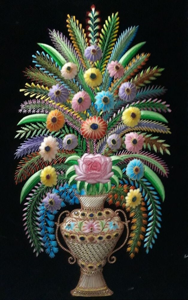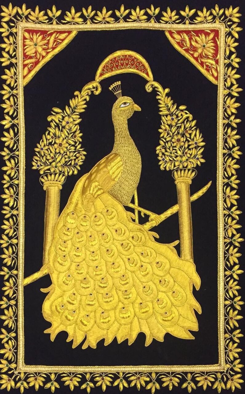 It is a heavy and elaborate metal embroidery from an Iranian and Indian-subcontinent that is done by our craftsmen on silk, satin or velvet fabrics. Designs are made using gold and silver threads with precious pearls, beads and stones.